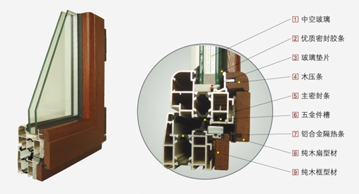 (1)其室外部分采用鋁合金專用模具擠型材,表面進行氟碳噴涂,可以抵抗陽光中的紫外線及自然界中的各種腐蝕,可有多種顏色及圖案供業主選擇,室內部分為經過特殊工藝加工的高檔優質木材,可按業主要求選用木材種類,木材表面采用德國優質油漆涂裝,抗紫外線、防水,抗腐蝕性能極佳,綠色環保。采用門窗專用型材,變形小,能與室內各種裝飾風格相協調,起到良好的裝飾作用,并與室內裝飾漆為一體,窗體線條具有美國風格及現代感,由于室內側木材型材阻斷了室內外能量傳遞的熱橋,節能效果非常明顯。